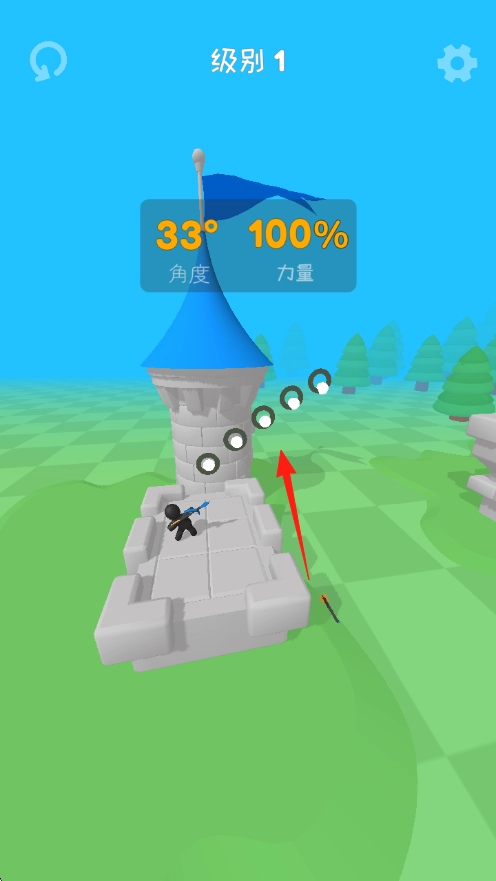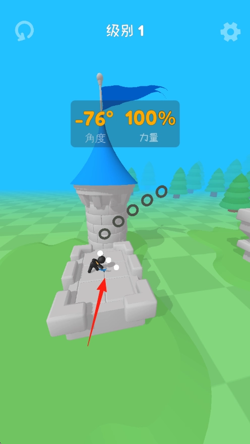 在城堡场景中调整角度与力度,通过滑动屏幕来改变箭头的指向,将弹射角度设定为-76°、33°,并把力量值设置为100%。