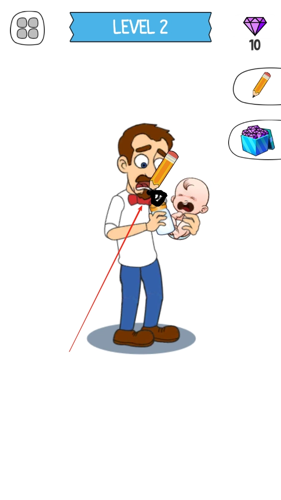 图里的小婴儿一直哭闹个不停,得把男人手里奶瓶上的奶嘴图案补画完整,这样小婴儿就能好好喝奶,不再哭闹了。