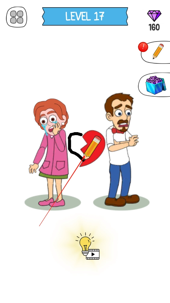 两人背对着彼此争吵落泪,只要把中间那颗破碎残缺的心画补完整,就能让他们重归于好,顺利进入下一关。