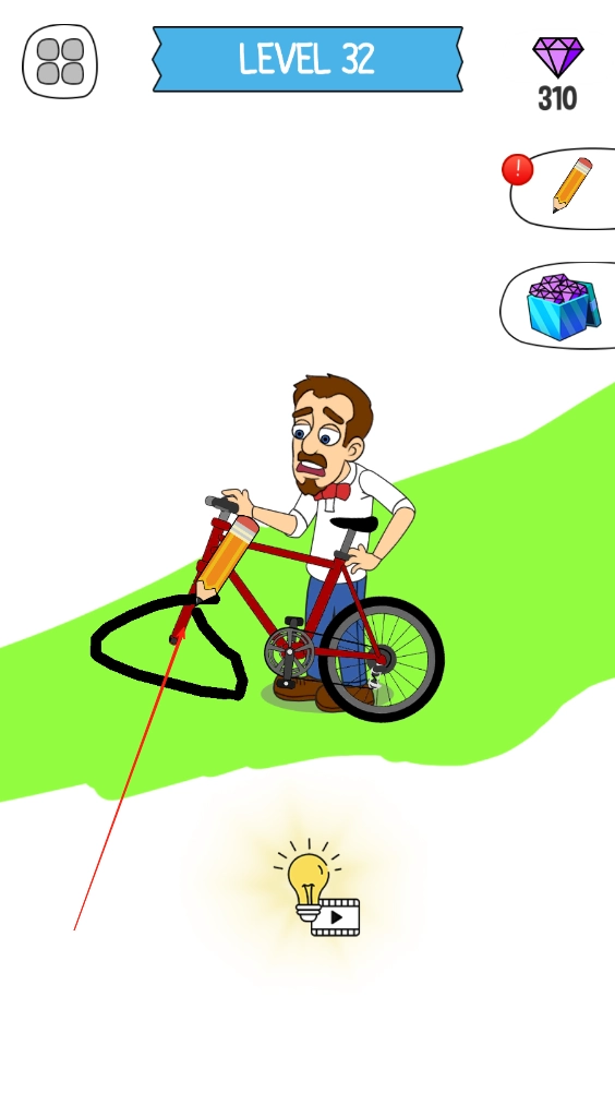 男人的出行工具出了故障,导致他没法正常出门。他那辆自行车少了个轮胎,只要在缺轮胎的地方画个圆把轮胎补全,就能顺利通关了。
