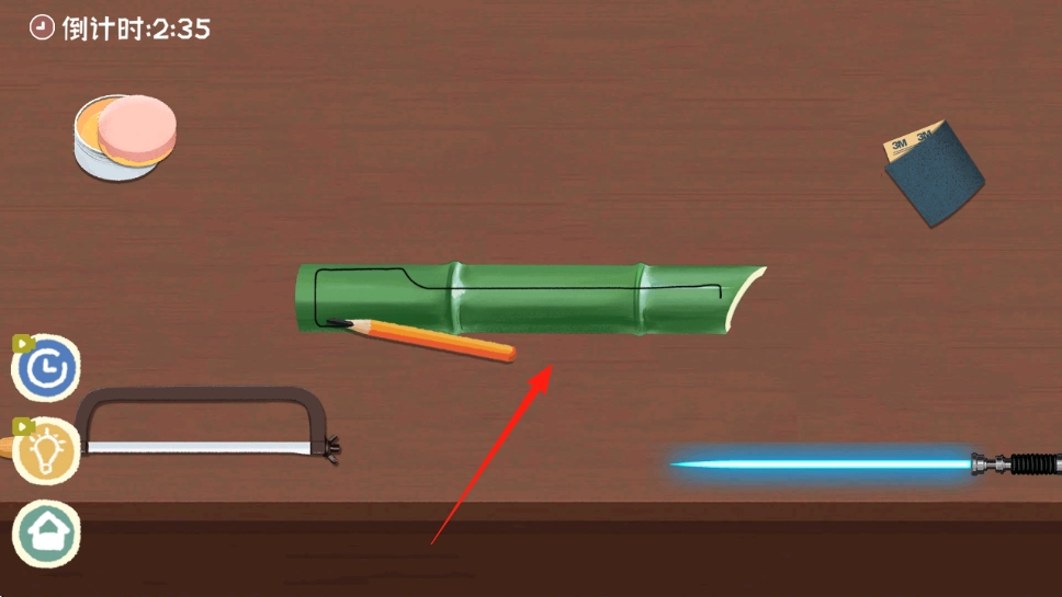拿起铅笔,沿着红箭头所指的线条在竹子上画出切割线,务必保证线条笔直、位置精准,这是后续切割作业的重要基础。