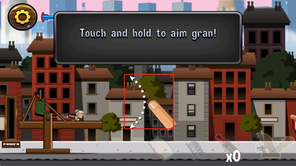 首先按照提示长按屏幕,调整弹弓的角度和力度,使老奶奶顺着虚线轨迹飞出,在此过程中要避开建筑之类的障碍。
