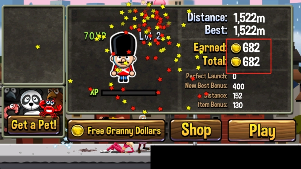 关卡结束后能获得682金币,这些金币既可以用来进入商店购买道具,也能用来强化老奶奶的能力,以便挑战更远的投掷距离。