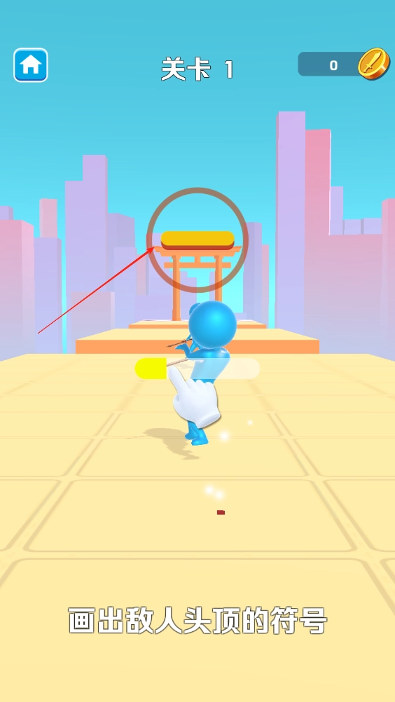 按照箭头的指引,画出敌人头顶的符号,通过滑动屏幕挥动大刀来划出相应的符号,以此消灭面前的蓝色小人。