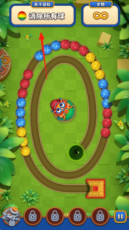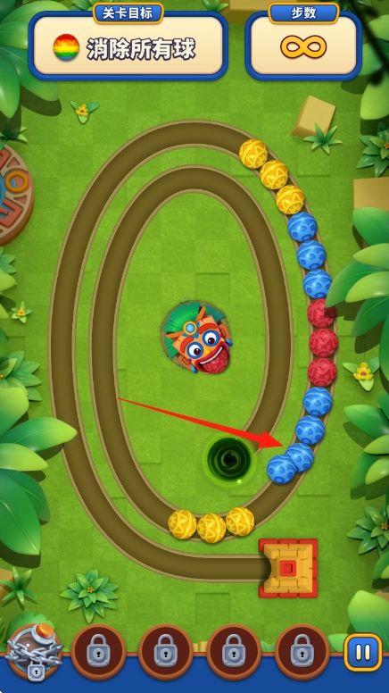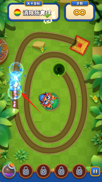 按照箭头的指示操作,把轨道上的蓝色、黄色等彩球消除掉,通过清空轨道来达成消除所有彩球的目标,要留意彩球正朝着黑洞的方向移动。