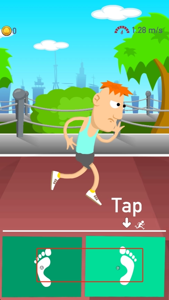 进入作品后,交替点击底部左右两侧的脚印按钮,以此来控制角色的跑步节奏,持续点击可提升上方速度表的数值。