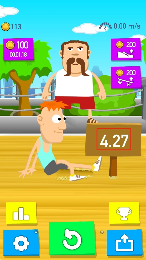 落地后结算成绩为4.27米,界面上显示有金币和道具解锁的选项,点击绿色的重玩按钮就能重新发起挑战,积累金币解锁加速道具可以帮助突破记录。