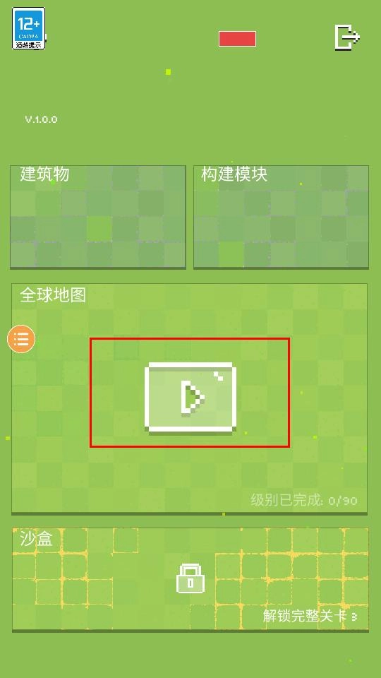 点击主界面全球地图区域的播放按钮,进入级别1关卡,即可查看建筑物构建模块等选项,开启建造冒险之旅。