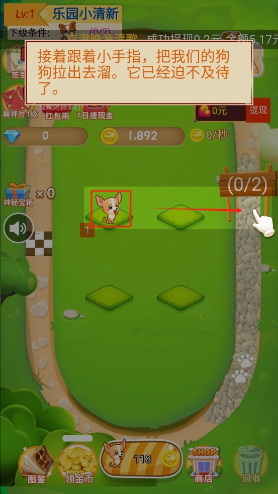 接下来按照提示,拖动红框里的小狗,顺着箭头的方向拉到右边的标识位置,完成遛狗的操作,以此推进关卡。