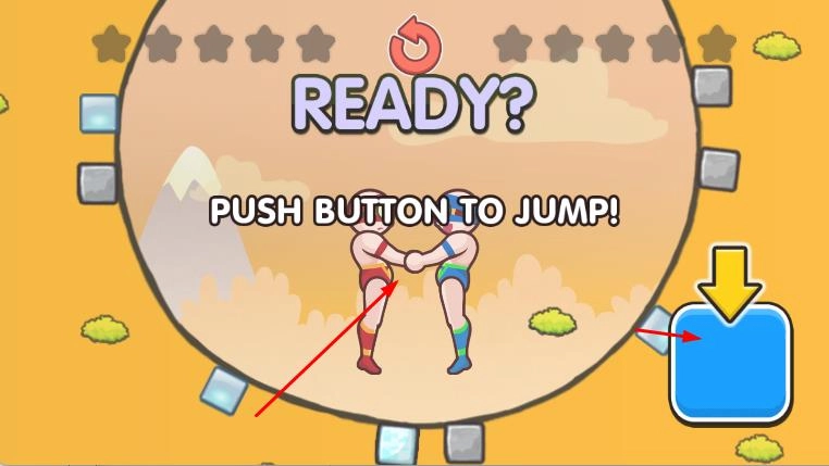 在游戏场景里,依照提示点击右侧的蓝色按钮,操控角色完成跳跃动作,和对手展开摔跤互动。