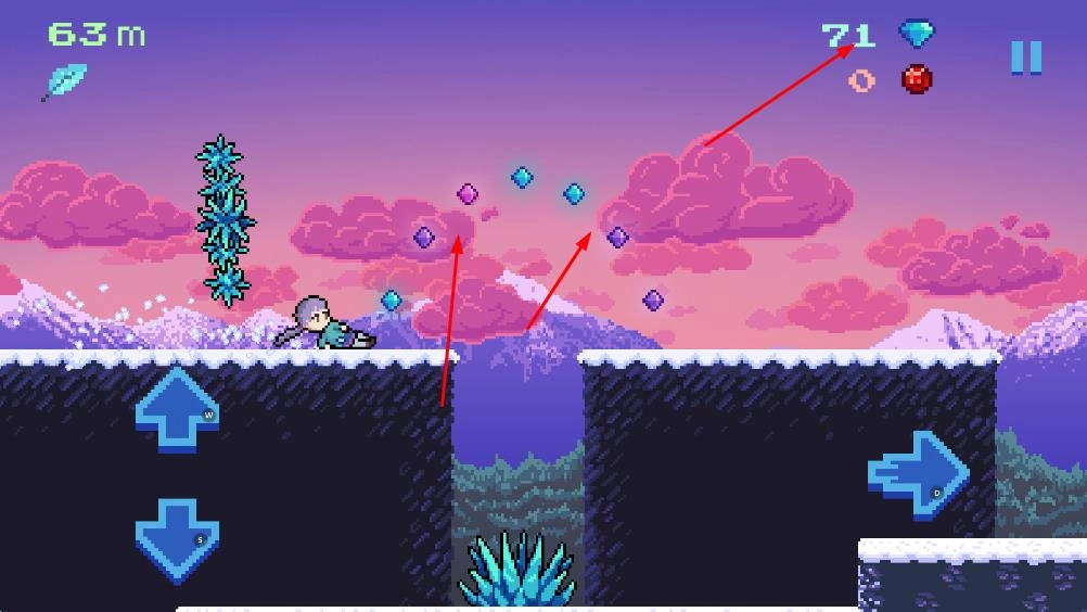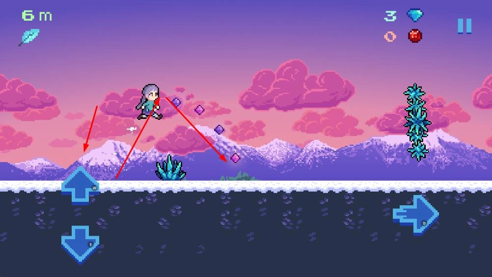操控角色沿着雪地小径前行,收集紫色的宝石,避开蓝色的冰晶障碍,开启关卡的挑战。