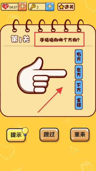 在第一关“题目手指指向哪个方向?”中,仔细观察图片里手指的指向,根据实际指向选择对应的方向选项,就能完成这一关卡的挑战。