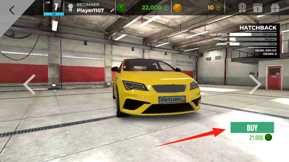 在车库界面,点击绿色的BUY按钮,用21,000绿色货币购买黄色的HATCHBACK汽车。