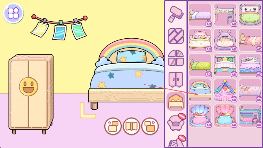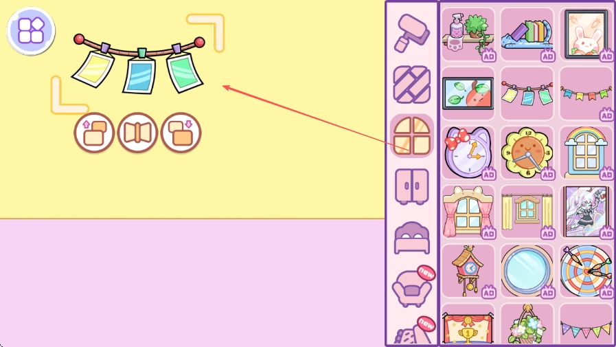 你可以从右侧的装饰栏中挑选照片挂饰,然后点击将其放置在房间内合适的位置来完成装饰。