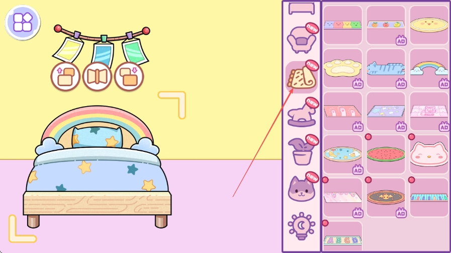 你可以继续在右侧的物品栏里挑选地毯之类的小物件,点击添加到房间,让布置更加完善。