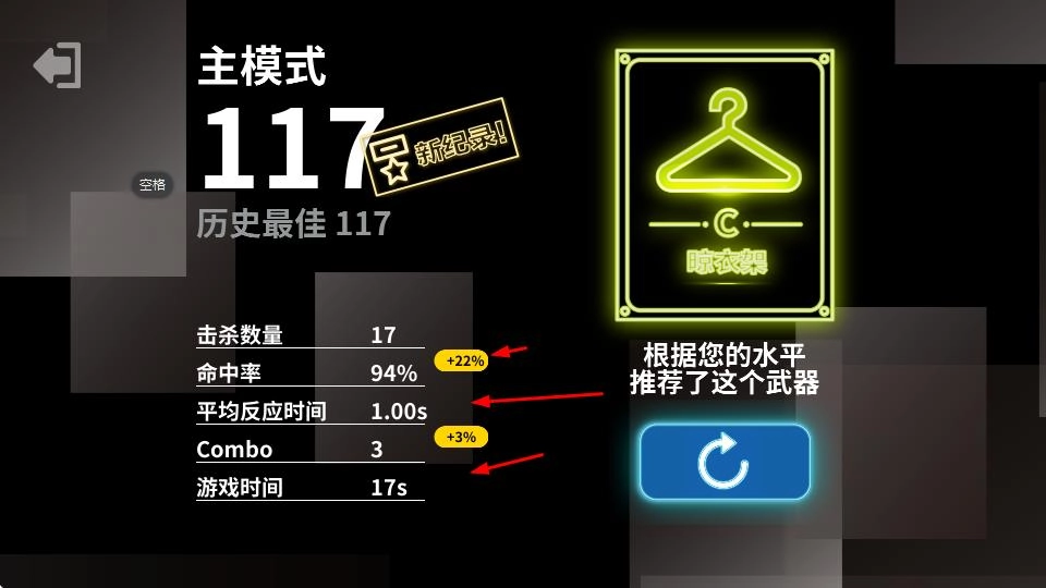 游戏结束后,你可以查看主模式下的得分、击杀数、命中率等数据,系统还会依据你的水平推荐合适的武器,点击重新开始按钮就能再次发起挑战。