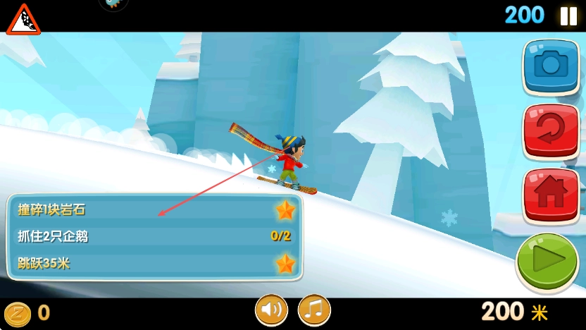 进入游戏后查看左侧的任务栏,就能清楚知道需要完成撞碎1块岩石、抓住2只企鹅、跳跃35米这些目标。