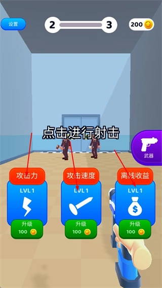 可以消耗金币来升级攻击力、攻击速度、离线收益等属性,以此增强枪械的战斗能力并提高资源获取的效率。