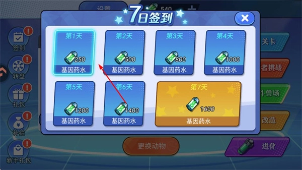 参与7日签到活动,每天签到都能领取基因药水之类的奖励,攒下这些资源就能用来培养恐龙啦。