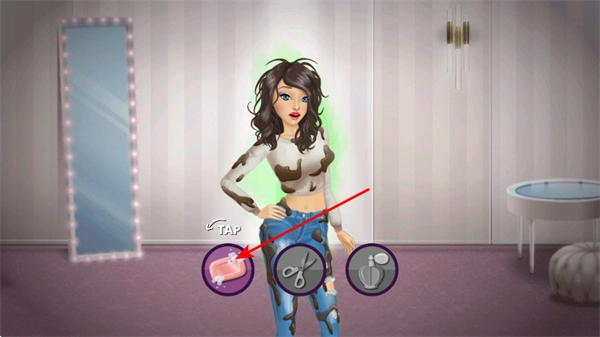 点击肥皂图标可以清洁角色脏污的衣物,让其外观变得整洁,这是打造角色形象的初始步骤。