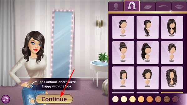 当你对角色的整体装扮感到满意时,点击Continue按钮,就能推进游戏流程,进入下一个装扮环节。