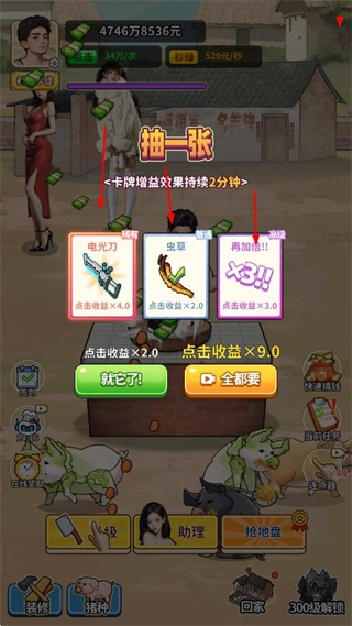 参与抽卡活动,获取增益卡牌,提升点击收益倍数,卡牌增益效果持续一定时间,助力快速获取金币。