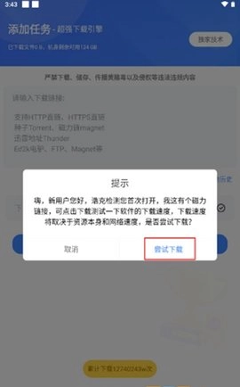 打开应用后,您会看到一个用于测试的磁力链接。请点击右下角的“尝试”按钮。