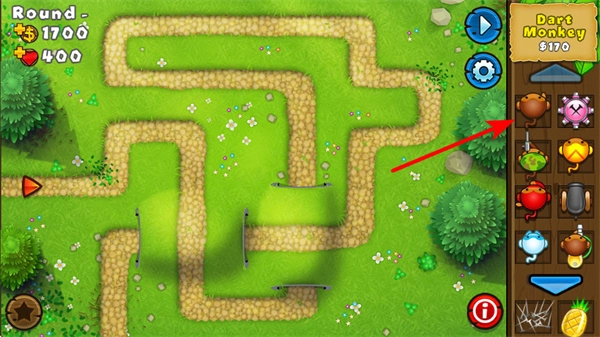 点击右侧的Dart Monkey等防御塔来建造,建造防御塔是抵御气球的关键环节,建造完成后就能在地图上放置这些防御塔,让它们对气球发起攻击并造成伤害。