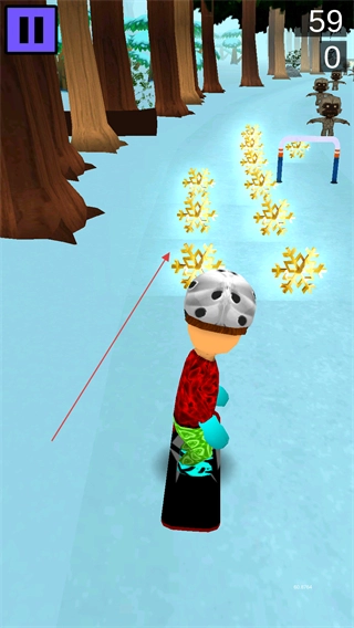 你需要操控角色在积雪覆盖的赛道上滑行,途中要避开树木、石块之类的障碍物,同时收集沿途出现的各种物品。