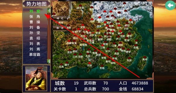 在势力地图的开局阶段,玩家可以选择刘宏等势力,开启充满策略与挑战的三国争霸征程,亲身感受不同势力选择所带来的独特游玩体验。
