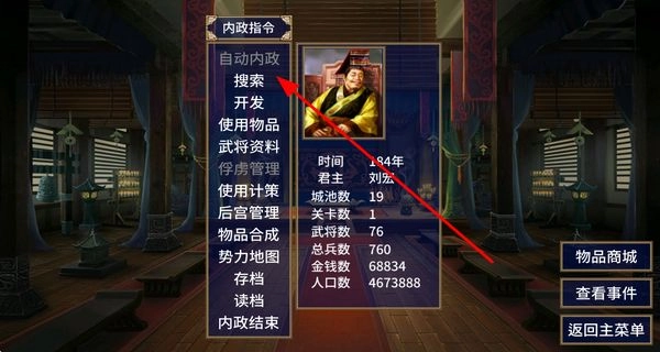 执行内政搜索指令,获取资源与武将,推动势力发展,助力三国争霸。