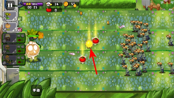 战斗时记得拾取场景里掉落的番茄等资源道具,它们能用来解锁新植物或强化已有的植物,及时收集这些道具可以补充防御阵线的战斗力。