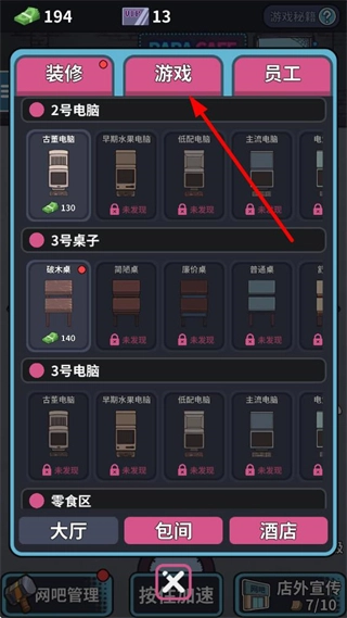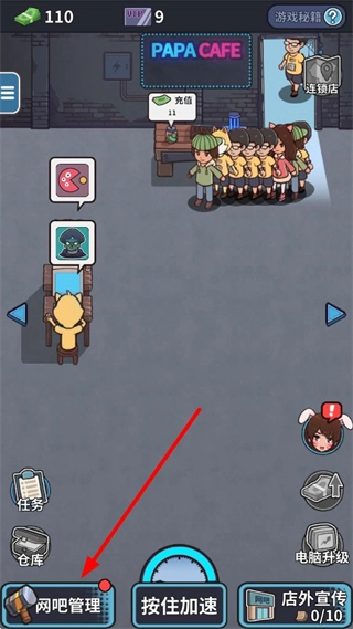进入网吧模拟业主界面后,找到界面下方的网吧管理按钮并点击,即可进入网吧管理操作界面。