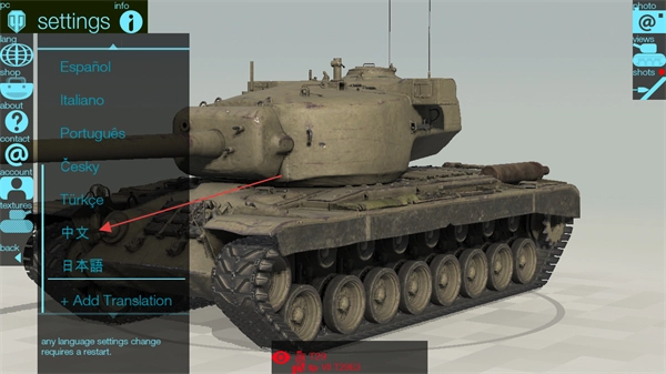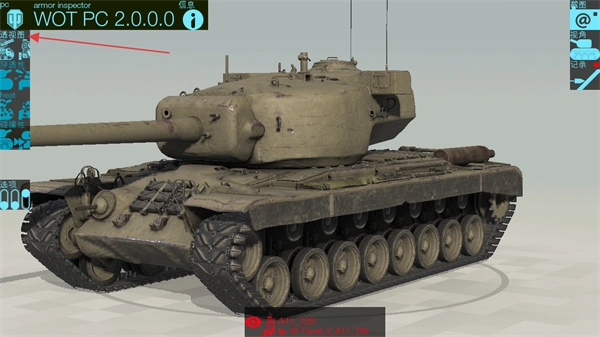 语言切换成中文后,界面上会呈现出装甲检查器、信息等中文标识,左侧的透视图属于坦克模型查看视角的选项之一,借助这类选项能够调整坦克的展示视角。