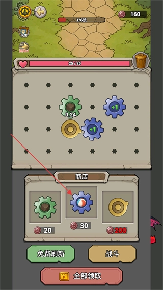 在这个界面下,你可以把属性相同的齿轮合成来提升等级,另外还能借助商店的免费刷新功能来更新道具。