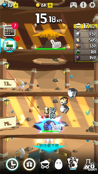 击碎岩石后,点击进入下一层的按钮,就能让挖掘深度进一步推进,比如达到15.18千米。