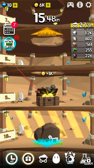 开启宝箱可领取额外奖励,比如1000金币,接着往下挖掘,能提高挖掘进度并增加资源收益。
