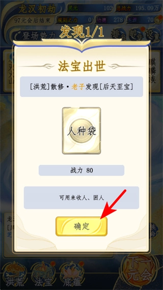 当法宝出世的提示界面弹出时,点击确定按钮,这是获取法宝并提升战力的核心操作,确认后法宝会加入势力体系,增强整体的战斗能力。