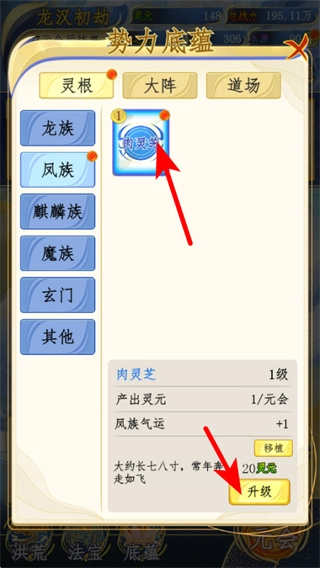 进入势力底蕴界面后,选择灵根道具并点击升级按钮,这是强化资源产出的关键操作。完成升级后,灵根的资源产出效率将得到提升,从而加快势力的发展进程。