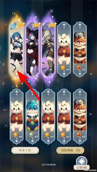 在召唤结果界面,查看箭头所指的角色卡片是确认获取角色的基础步骤,通过浏览该卡片就能了解所获得的角色信息。