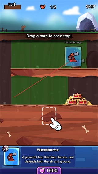 在关卡1的准备环节,根据提示从下方武器栏里挑选Flamethrower卡牌,这个陷阱能够对空中和地面单位进行攻击与防御。
