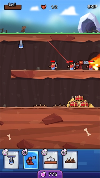 我们的核心任务是阻止恶棍从山洞里偷走宝藏,为此要在他们前往宝藏的必经之路上巧妙布置武器。每一次成功拦截都能确保宝藏安然无恙,这种清晰的目标设定,让塔防布局的过程充满了成就感。