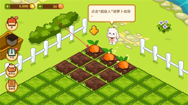 在游戏的农场区域,依据界面上的指引点击对应的作物,就能完成超人胡萝卜的收获,同时获取相应的资源。