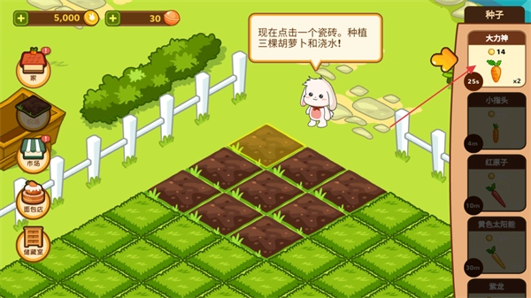 在农场的田地区域挑选任意一块土地,播下大力神胡萝卜种子,按照提示种好三棵胡萝卜并完成浇水,就能推进当前的种植流程。