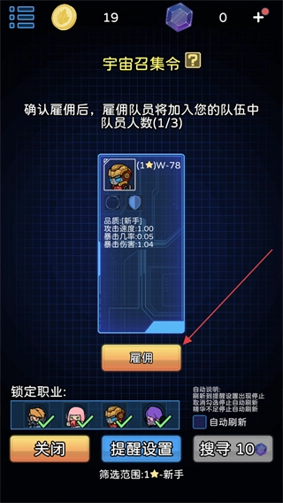 在宇宙召集令界面选好队员后,点击雇佣按钮就能把他们添加到队伍里。