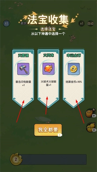 在法宝收集界面,你可以挑选增益类法宝,也能直接选择“我全都要”来获取所有法宝,以此增强战斗能力。