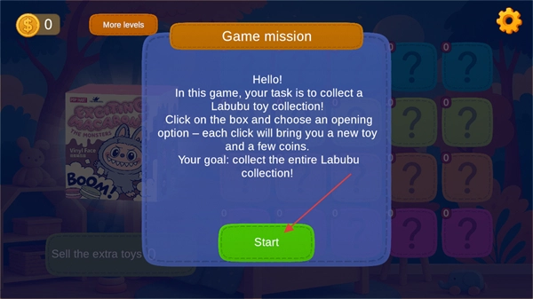 在拉布布开箱模拟器的界面里,游戏任务是收集完整的Labubu玩具系列,点击红色箭头指向的Start按钮,就能开启游戏的游玩流程了。