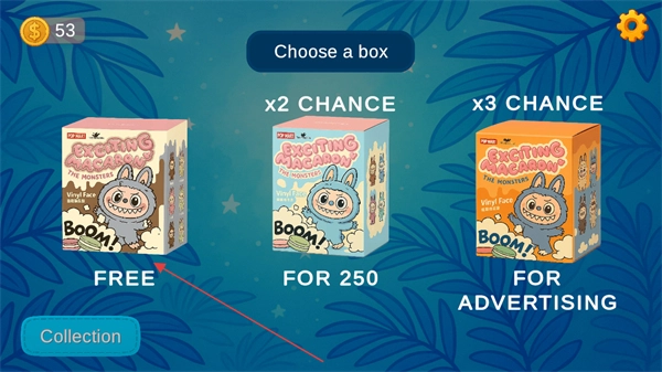 进入盲盒款式选择界面后,找到红色箭头指向的FREE盒子并点击开启,这样就能得到新玩具和金币,从而推动收集进度的完成。