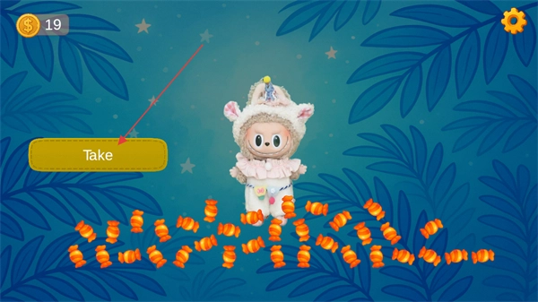 打开盒子拿到新的Labubu玩具后,点击这个玩具会有惊喜彩蛋掉落,此时点击左边的Take按钮,就能领取该玩具和地面上的物品。