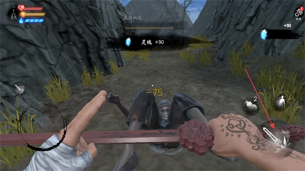 在攻击怨骨妖魂时,你只需点击界面右侧的攻击按钮就能发起攻击,与此同时敌人会相应扣除血量,将其击倒后你可以获得30点灵魄的奖励。